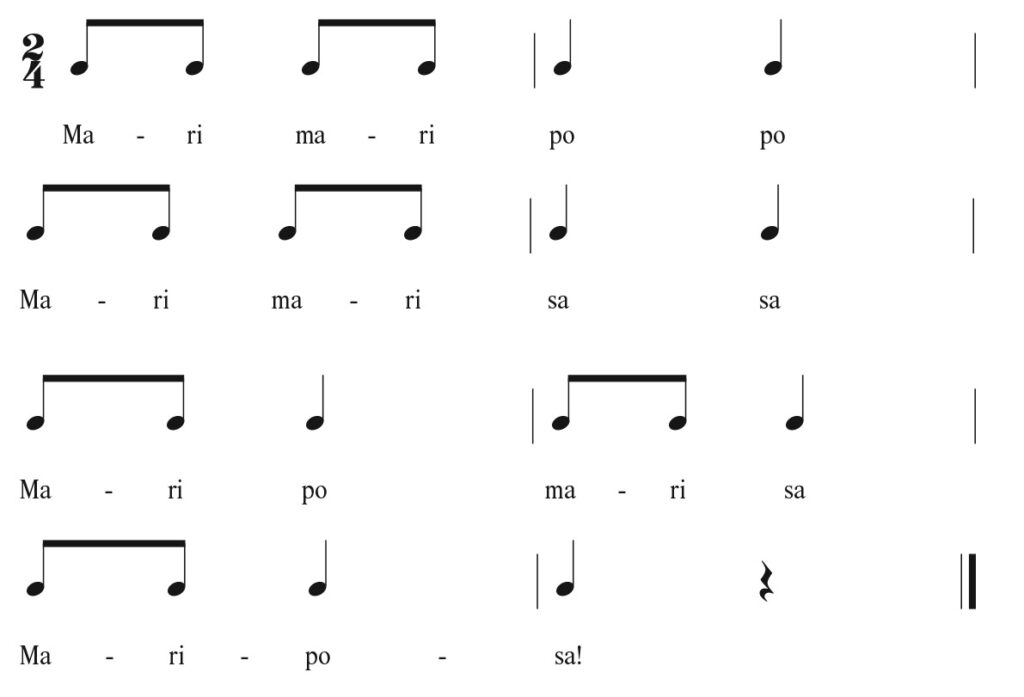 - The teacher sings four-beat melodic phrases using the rhythms and the tone set—do, mi, so, la—and students echo.